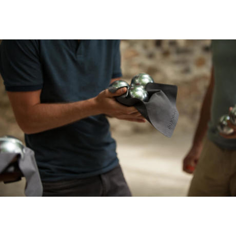 La microfibre retient les impuretés lors du passage sur la boule de pétanque.